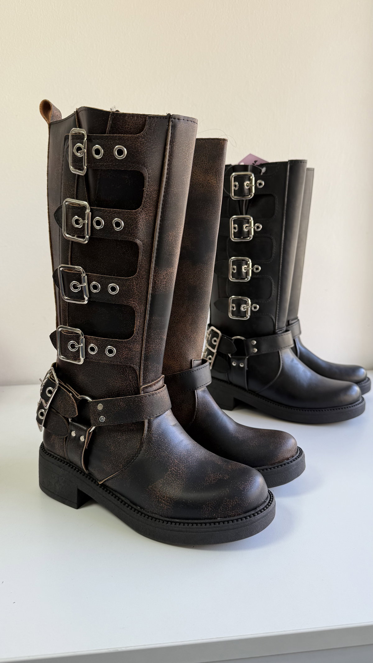 Botas con herrajes, realizadas en cuero ecológico P.u. Cuenta con cierre, caña de 36 cm y una base de 4cm que la hace súper cómoda