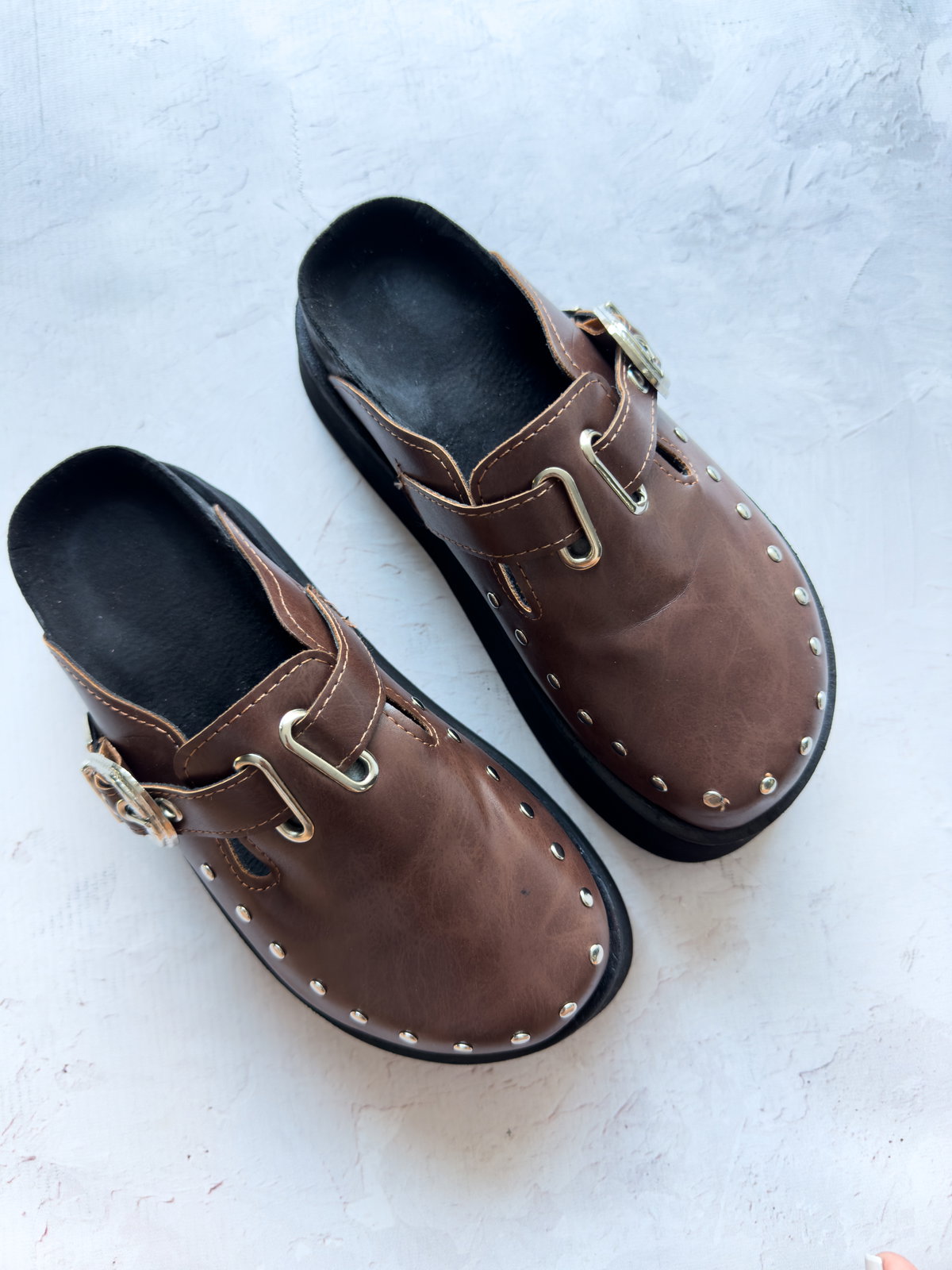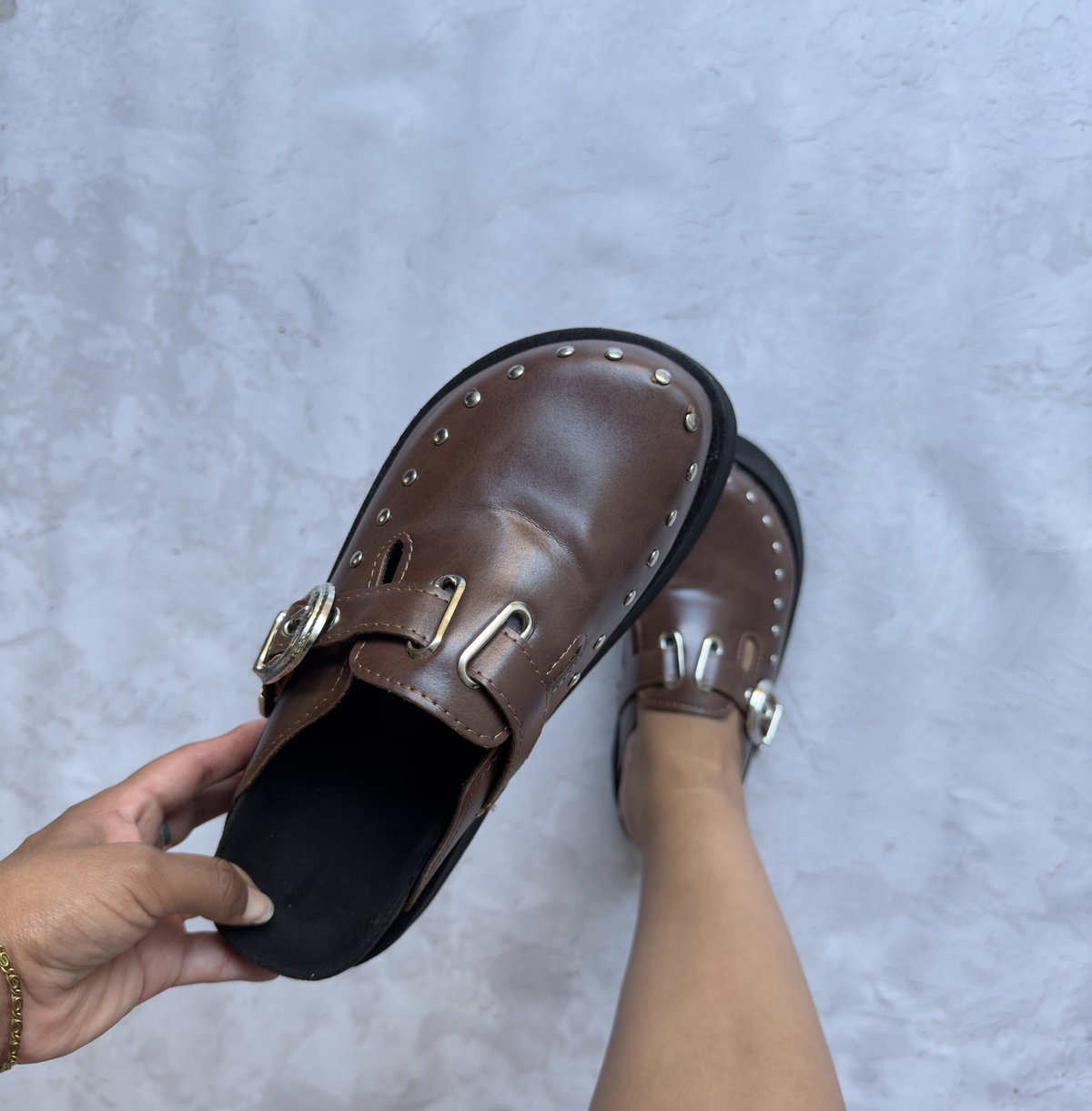 zuecos realizados en cuero ecológico P.U, base de Eva de 5cm, detalles de tachas en la capellada