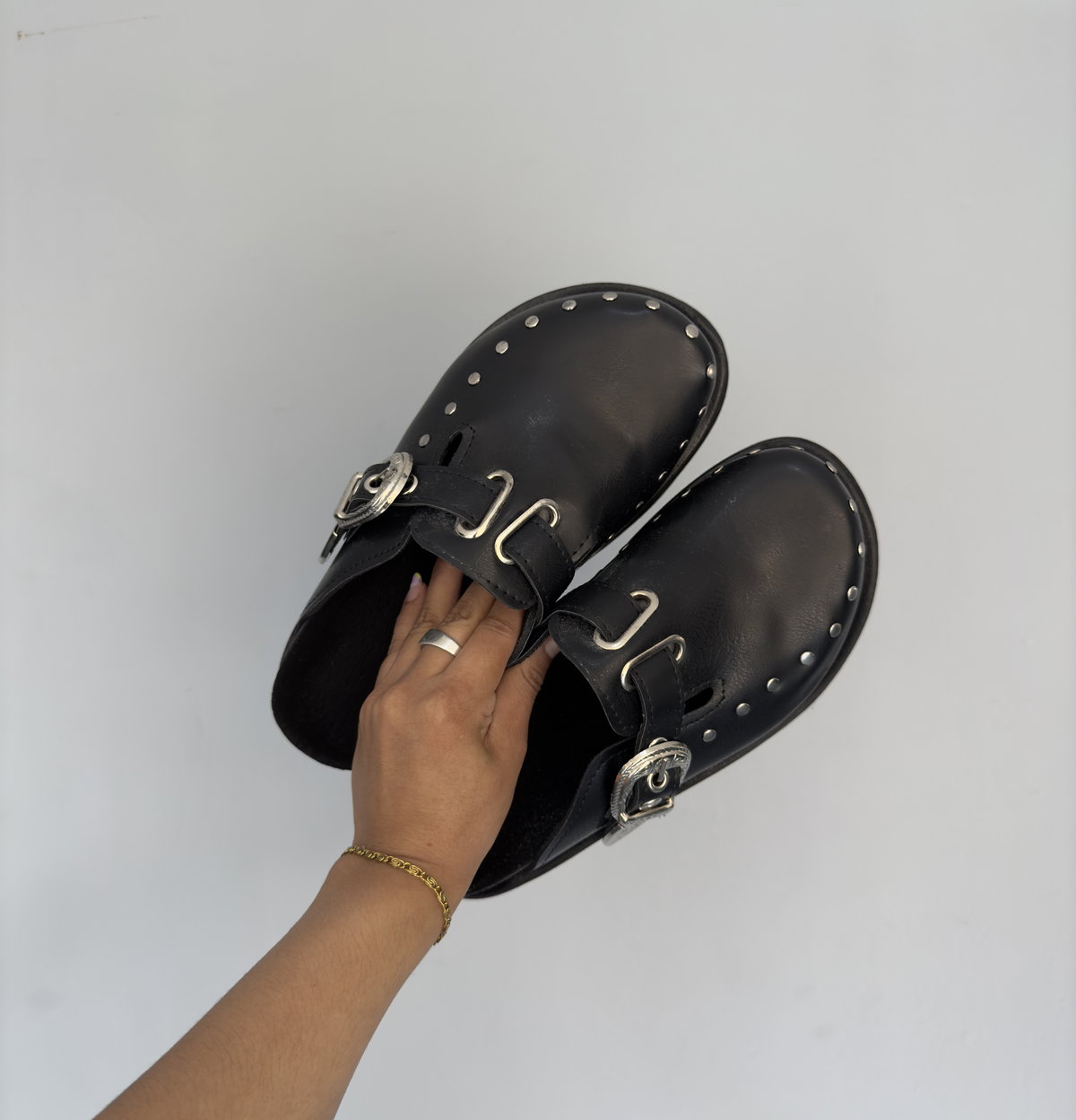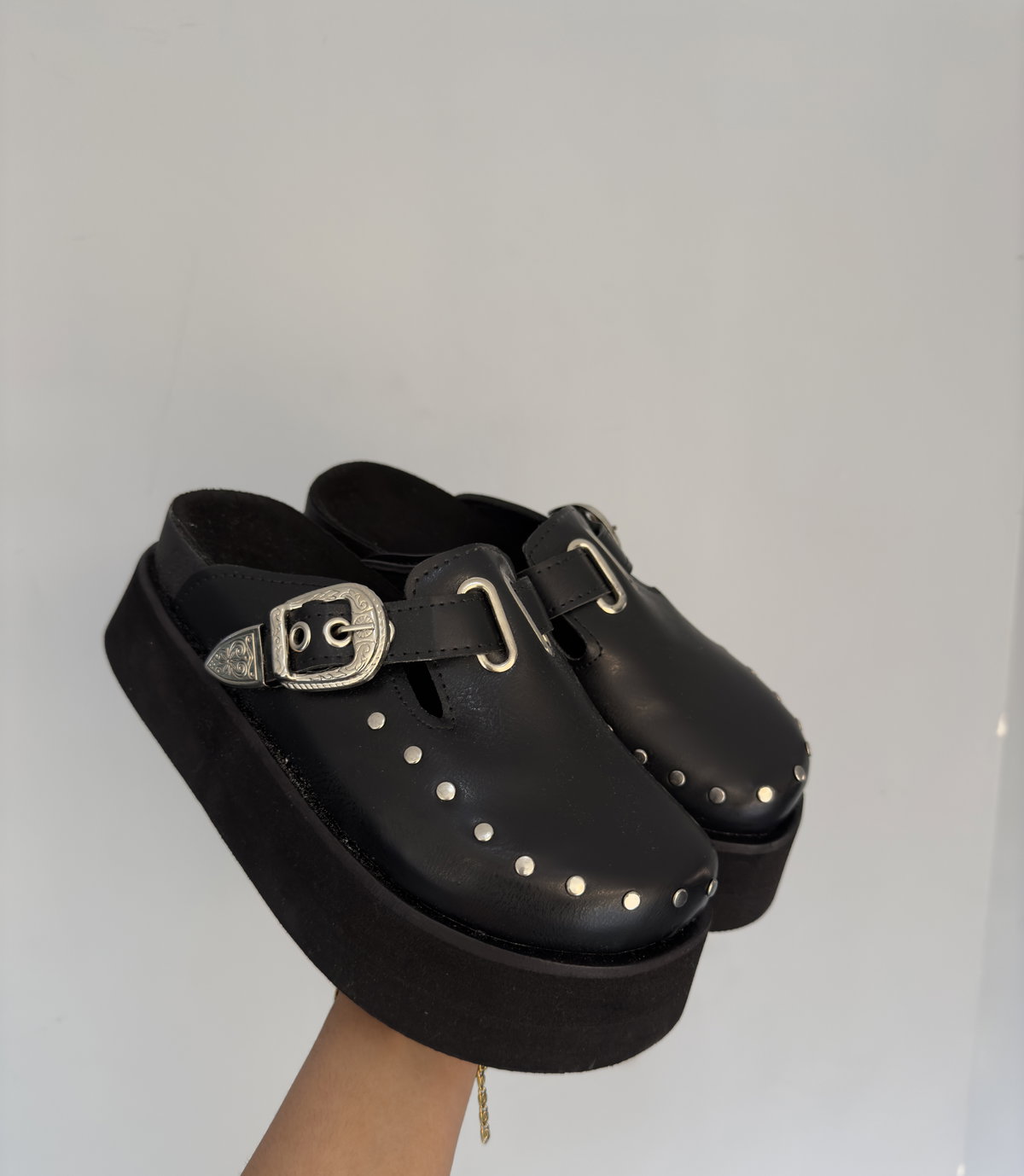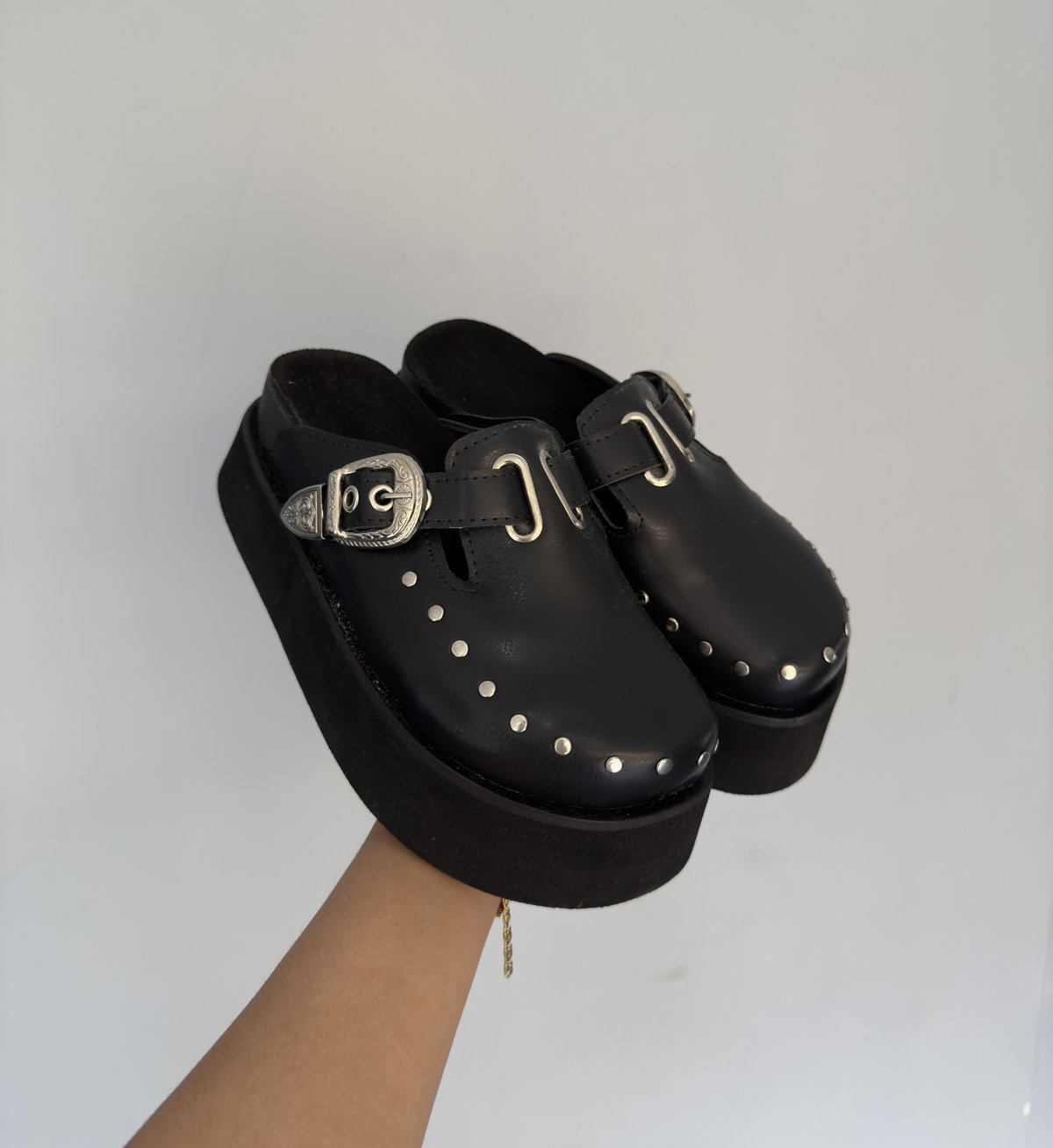 zuecos realizados en cuero ecológico P.U, base de Eva de 5cm, detalles de tachas en la capellada
