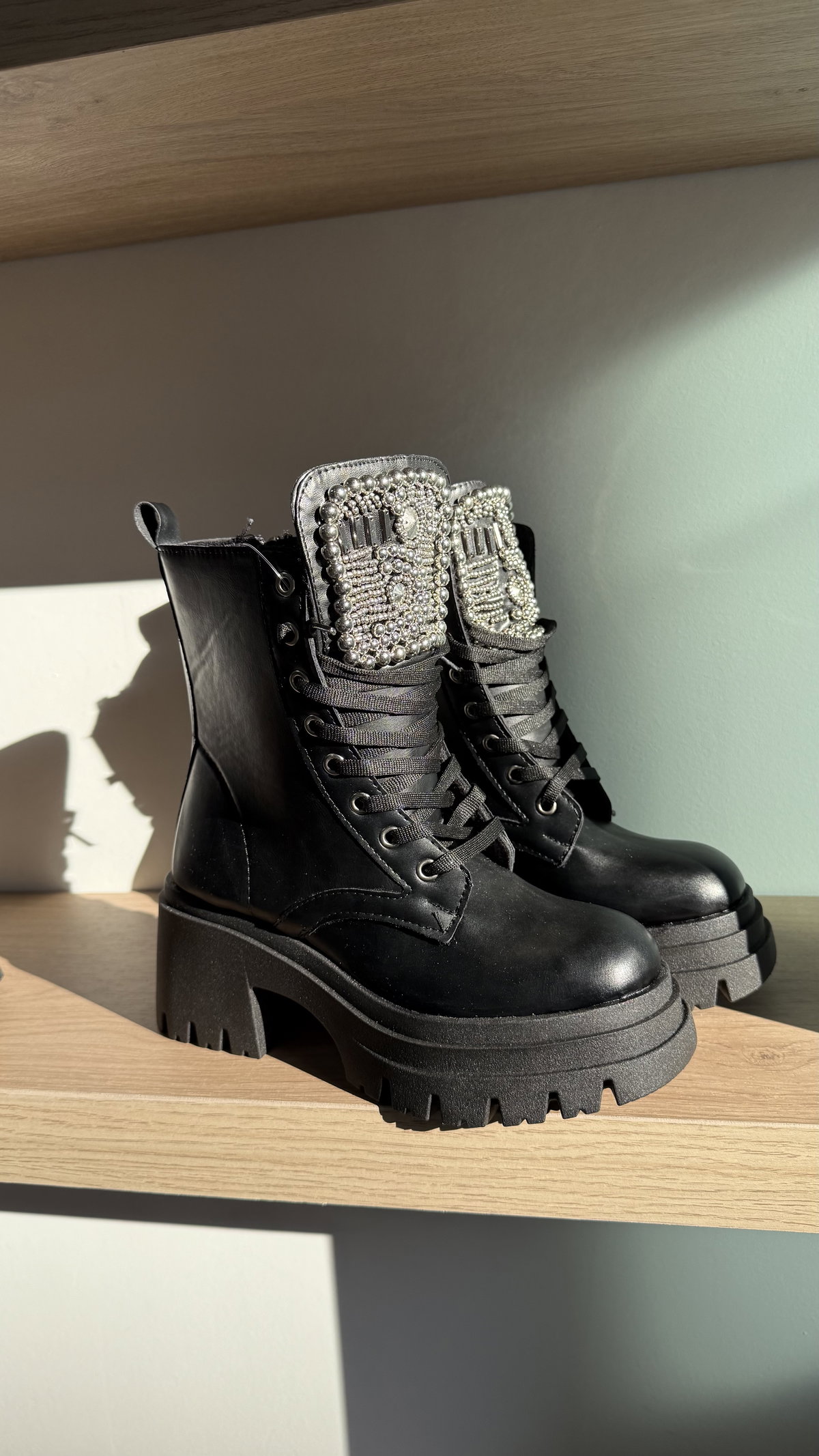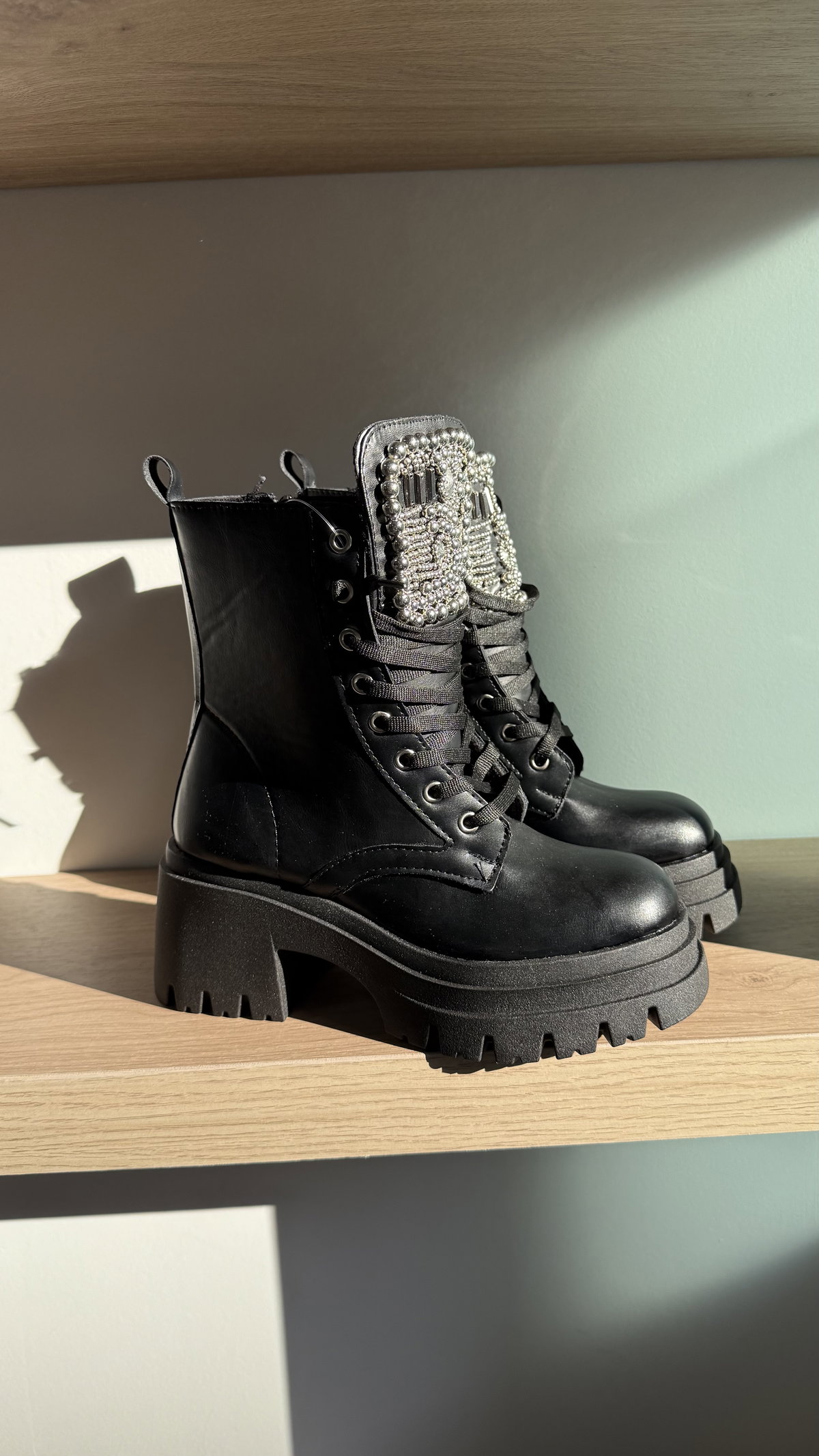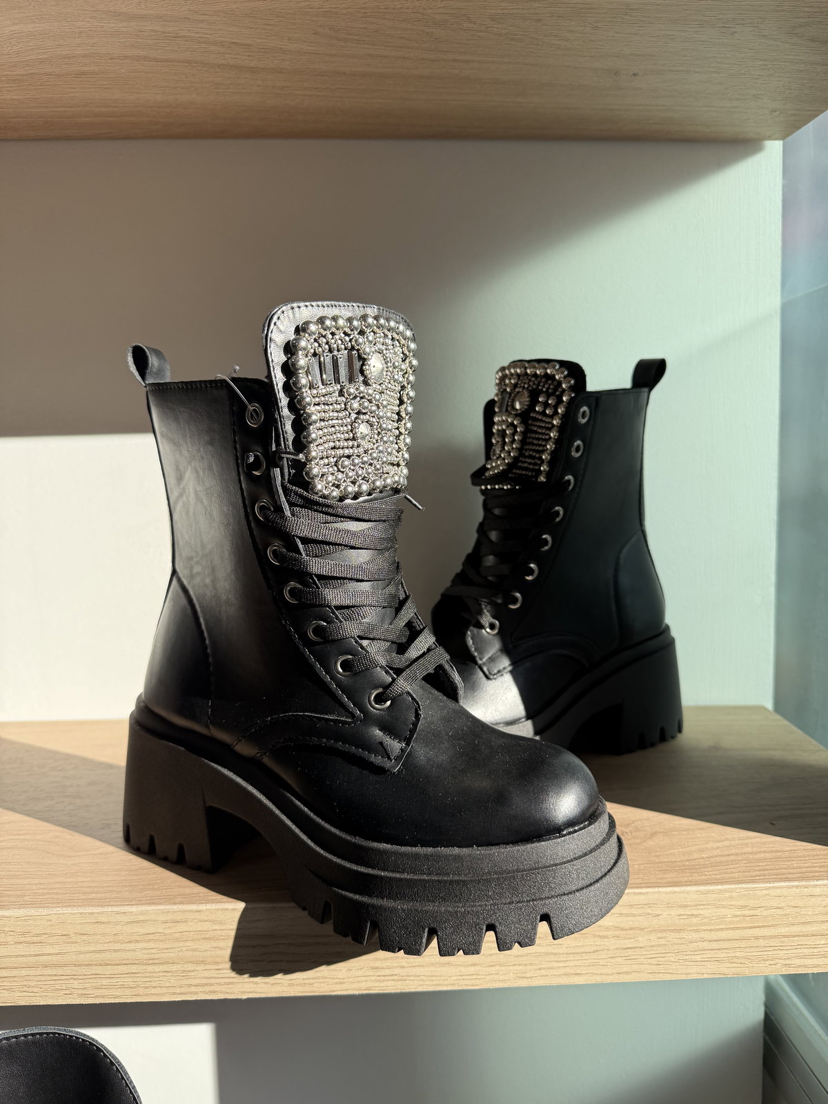 Borcegos con detalles de piedras en la legua, base de 4cm, taco de 9cm
