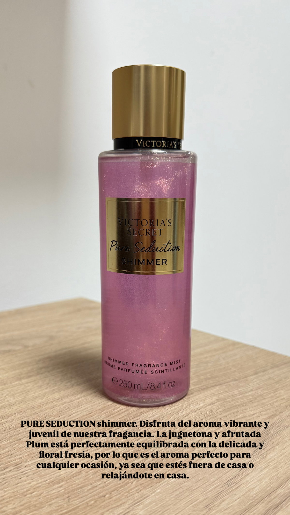 El body splash Pure Seduction Shimmer de Victoria’s Secret es una versión brillante del clásico Pure Seduction, con el mismo aroma pero con partículas iluminadoras que dejan un efecto shimmer (brillo) en la piel.