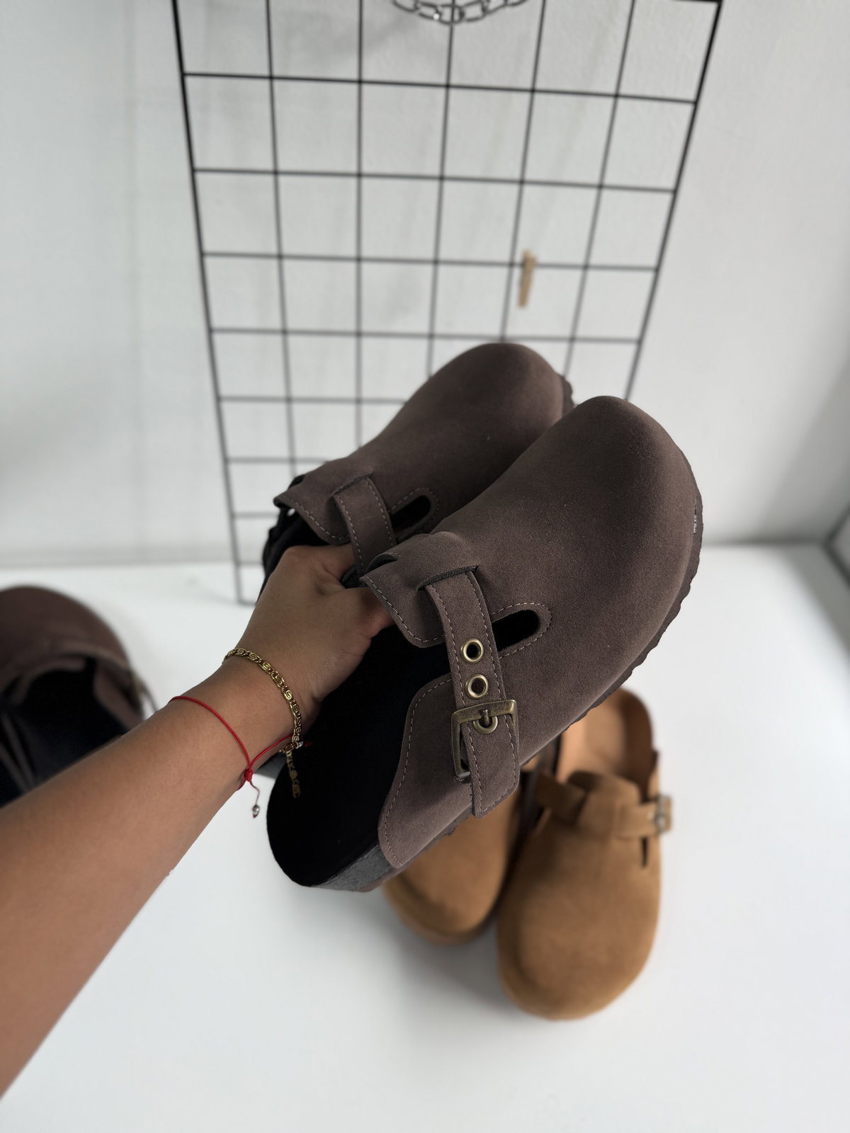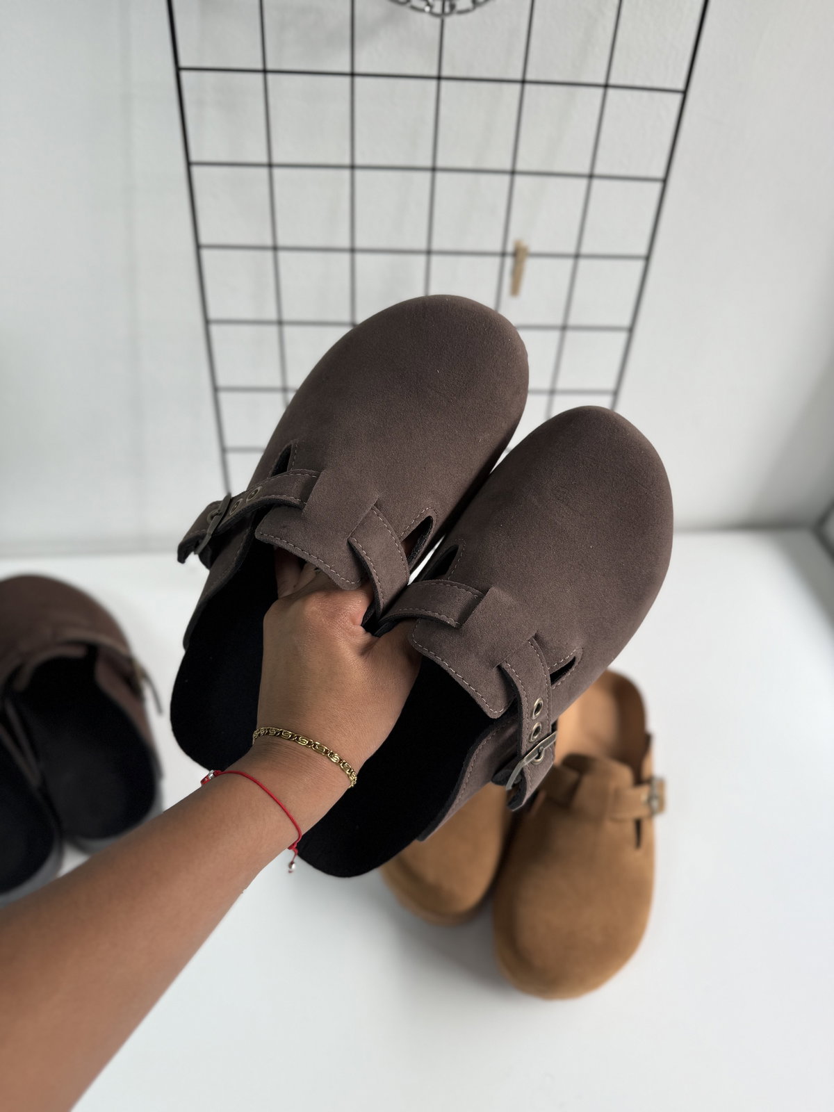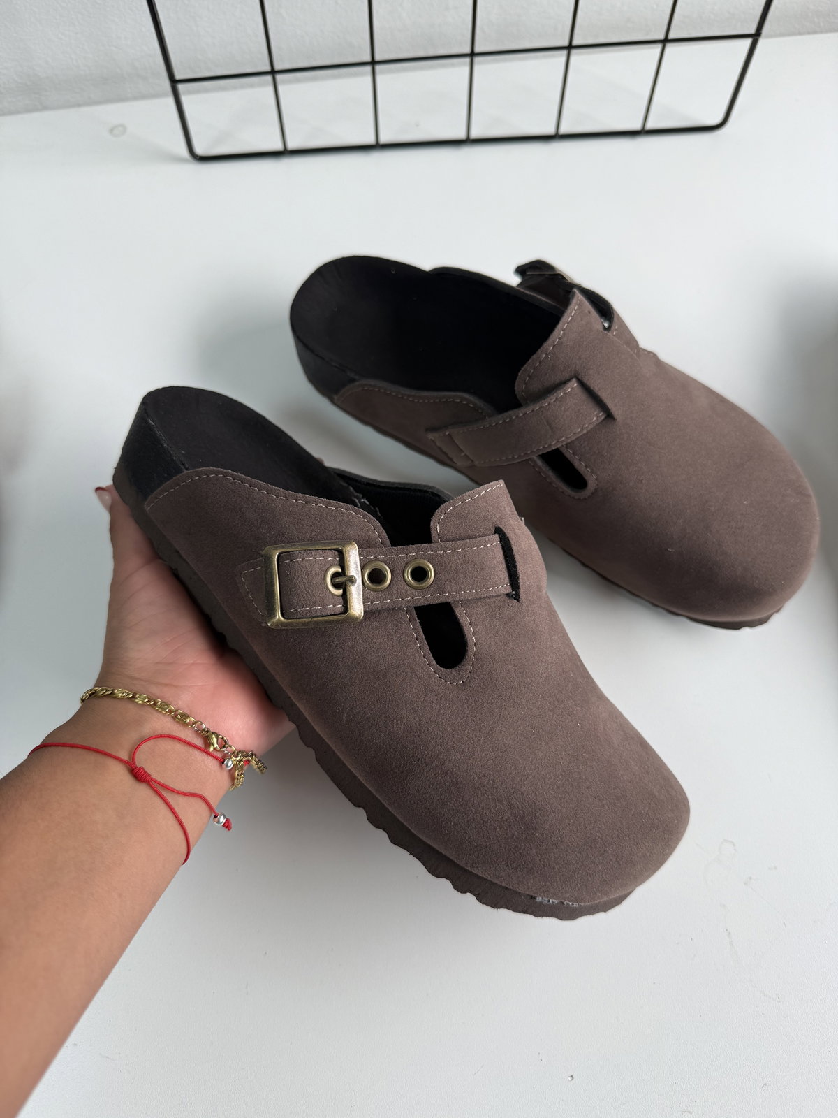 Zuecos gamuzados color tierra, realizados en base de eva súper livianos.
