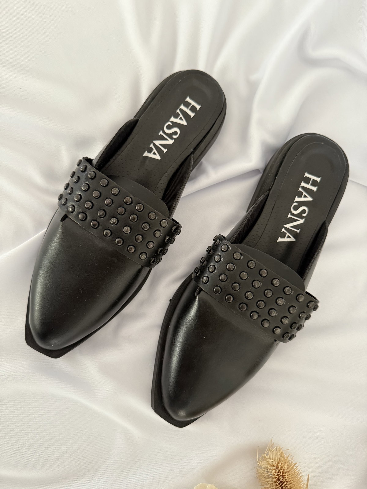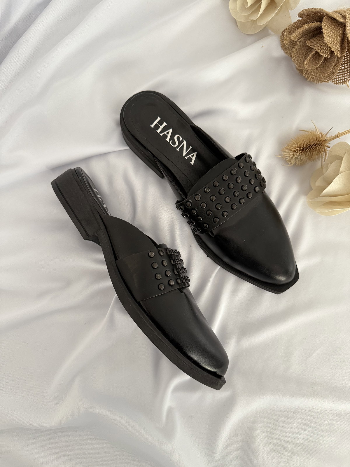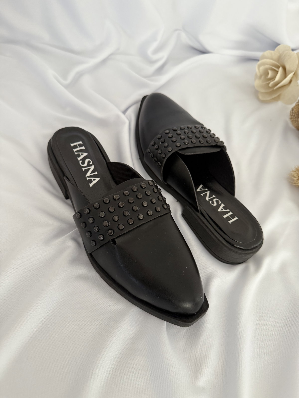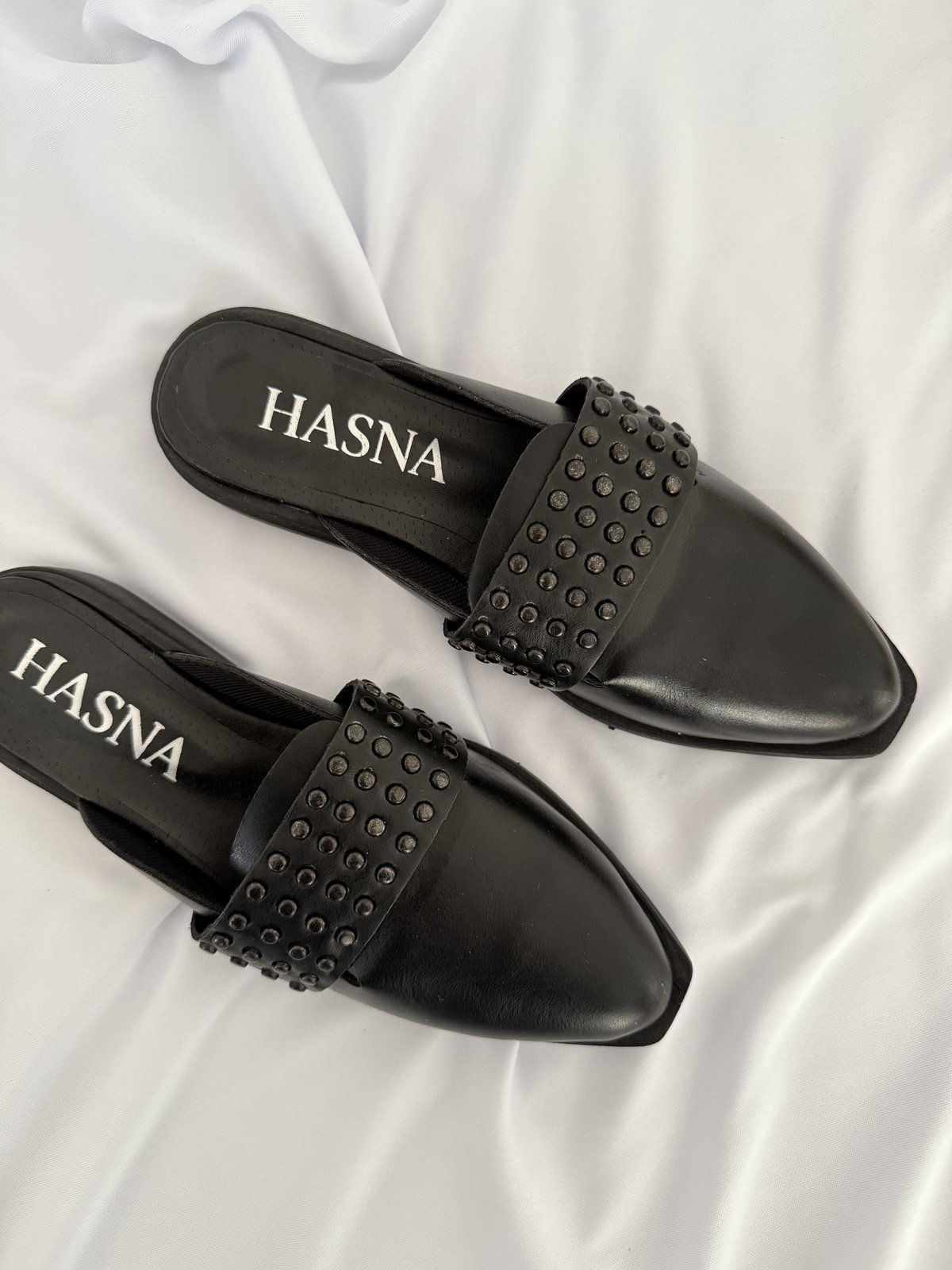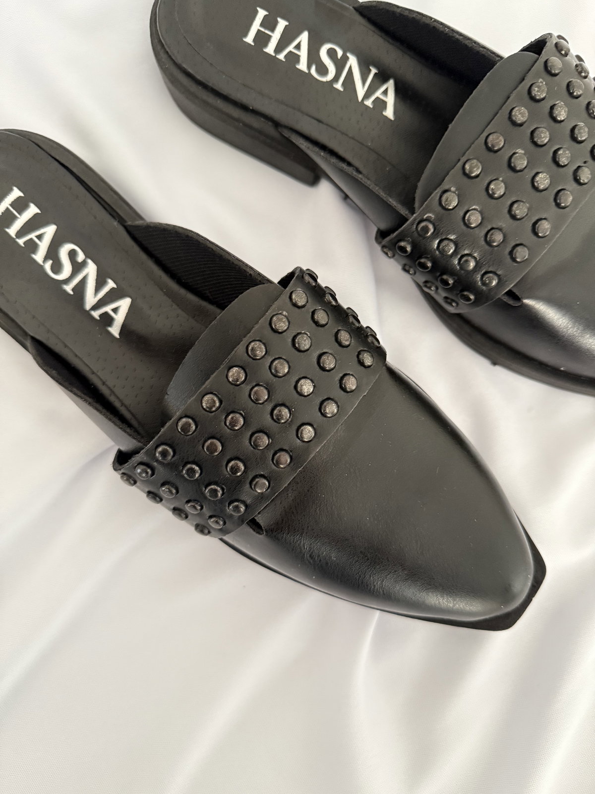 Zuecos en punta realizados en cuero ecológico P.U, taco de 2cm