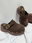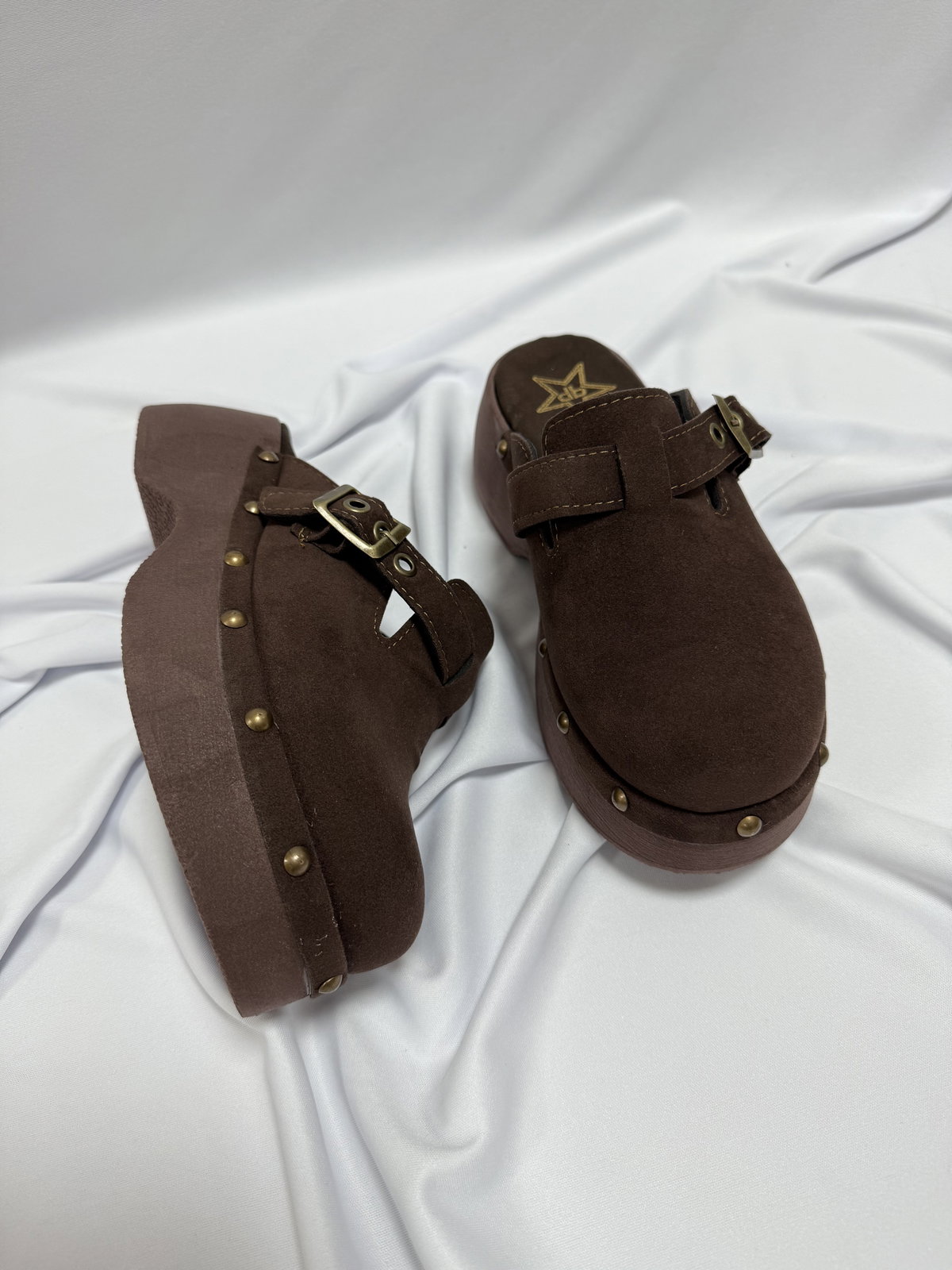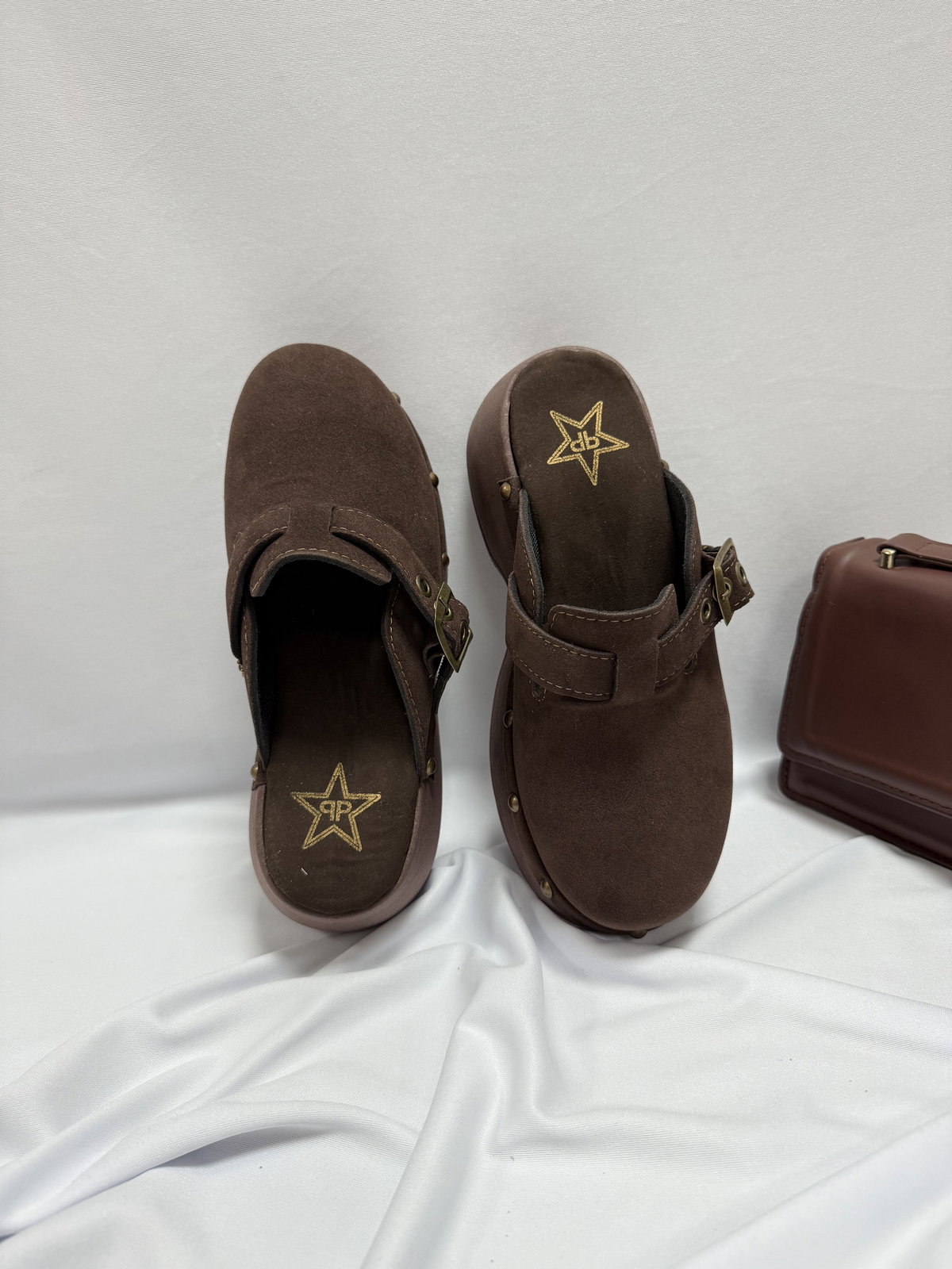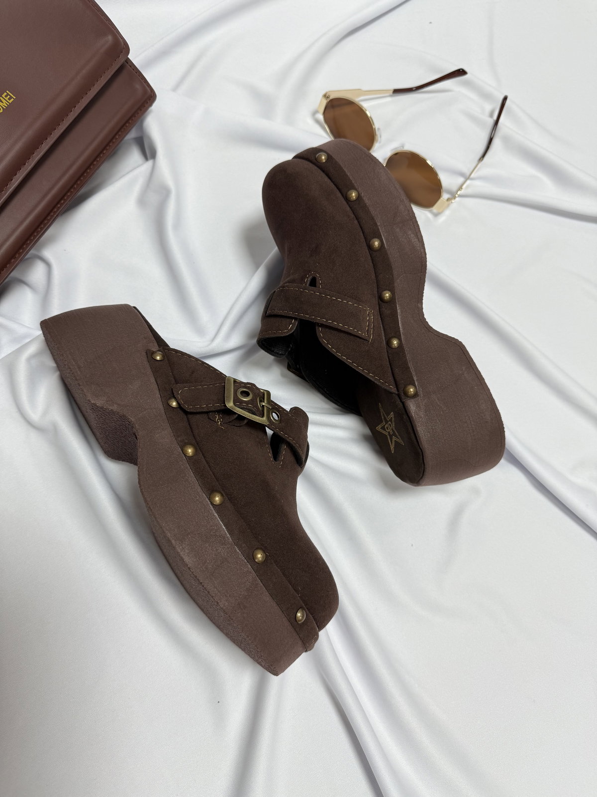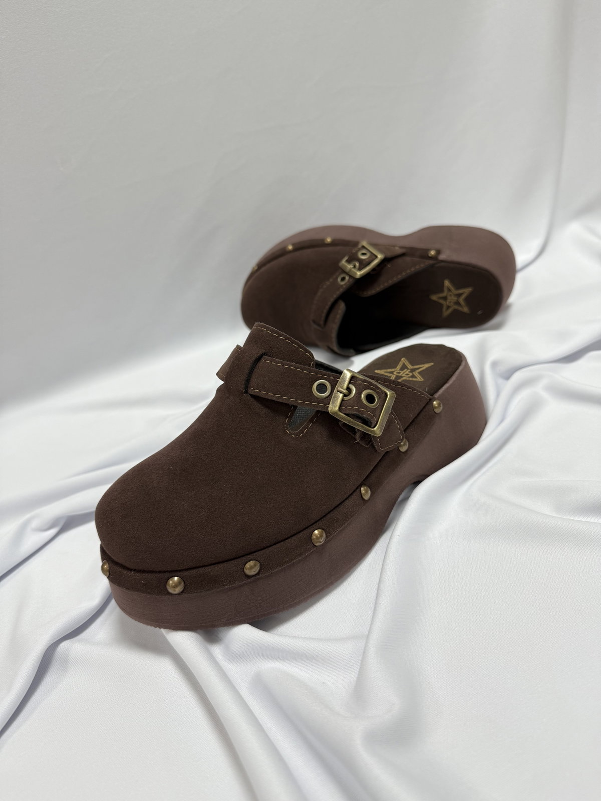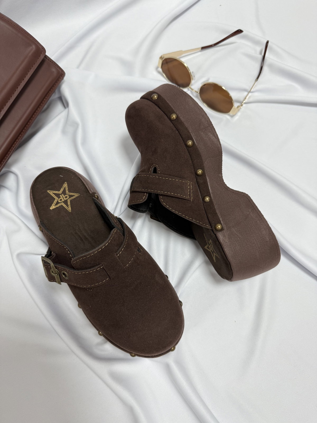 Zueco gamuzado en color chocolate, con detalle de de tachas a su alrededor, plantilla acolchonada lo que hacer que tu caminar sea cómodo, plantillas antideslizantes.